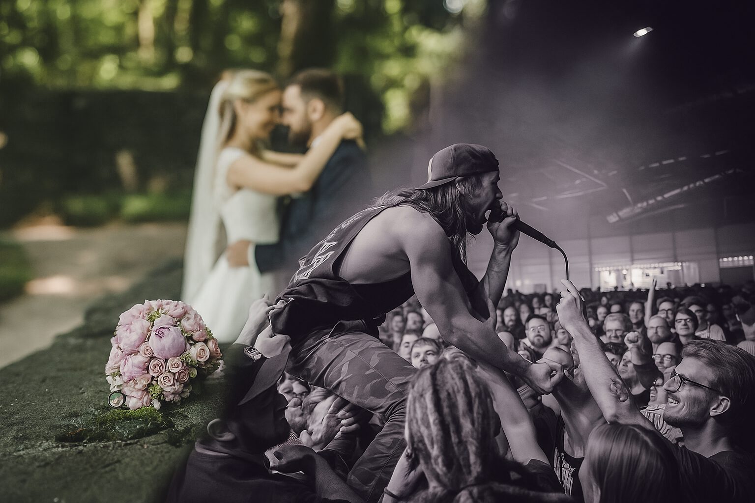 Bei Konzerten war ich ständig in Bewegung – von links nach rechts, in der Menge, hinter dem Schlagzeuger, auf der Bühne, manchmal sogar draußen durch ein Fenster. Ich habe nie stur von einem Platz fotografiert. Und genau so mache ich es heute bei Hochzeiten. Ich laufe, ich beobachte, ich fange ein. Meine Beine danken mir das am nächsten Tag selten, aber die Bilder tun’s.